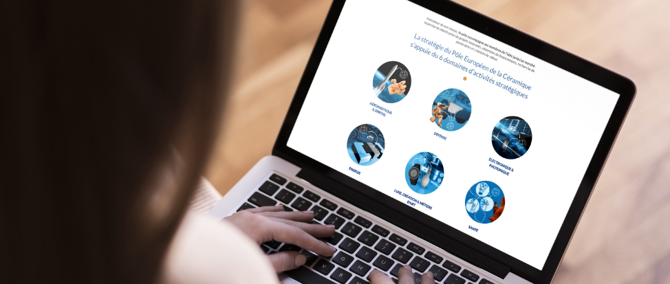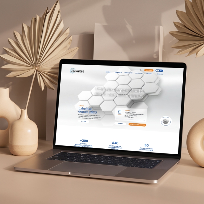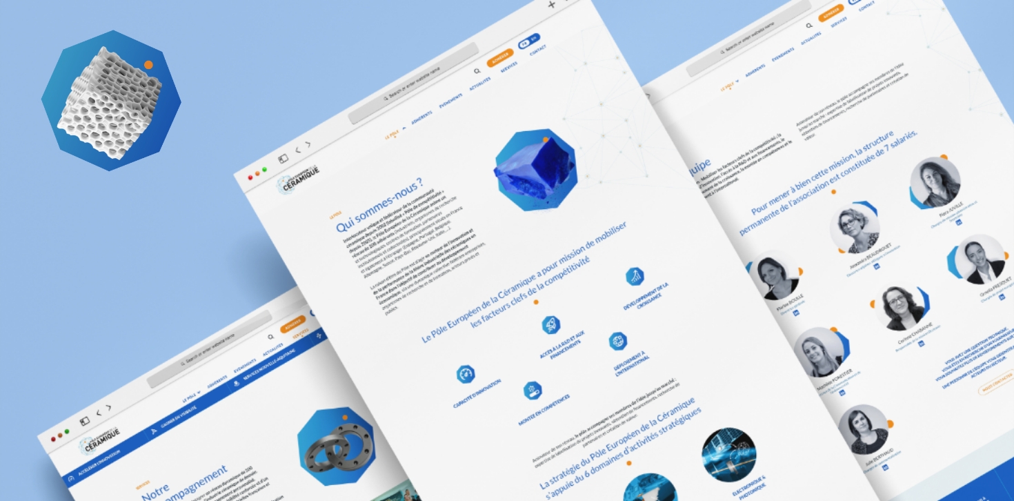 La refonte s'est construite autour d'une question simple : comment représenter visuellement une filière dont les productions sont souvent invisibles à l'œil nu ? La céramique technique ne se donne pas à voir facilement. Nous avons fait de cette contrainte un territoire créatif, en développant une série de visuels abstraits conçus pour évoquer la puissance formelle et la diversité d'application de la céramique. Ces créations constituent le socle visuel du site et ont donné naissance à la vidéo d’accueil, qui installe dès le premier regard les deux idées fondatrices du Pôle : modularité et réseau.